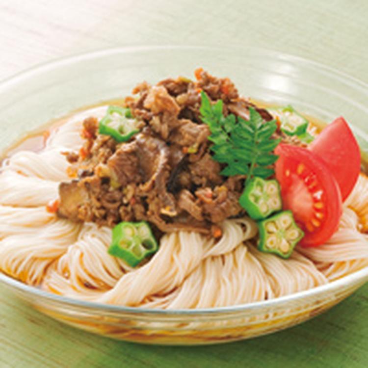 パッケージ通りに茹でたそうめん・トマト・(2)・(3)を器に盛り、木の芽を添えてつゆをかけていただく。