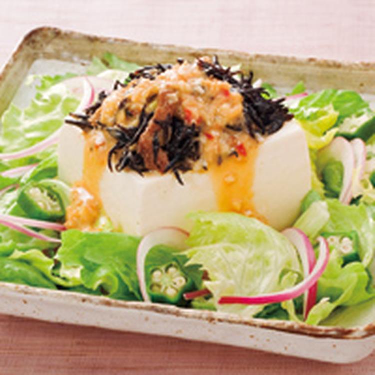 器に豆腐を盛って、B・(2)を彩りよくのせ、(1)をかけていただく。