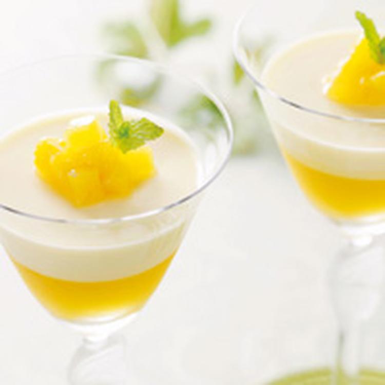 固まったら、取り分けておいた(1)のマンゴーを角切りにしてトッピングし、あればミントを飾る。