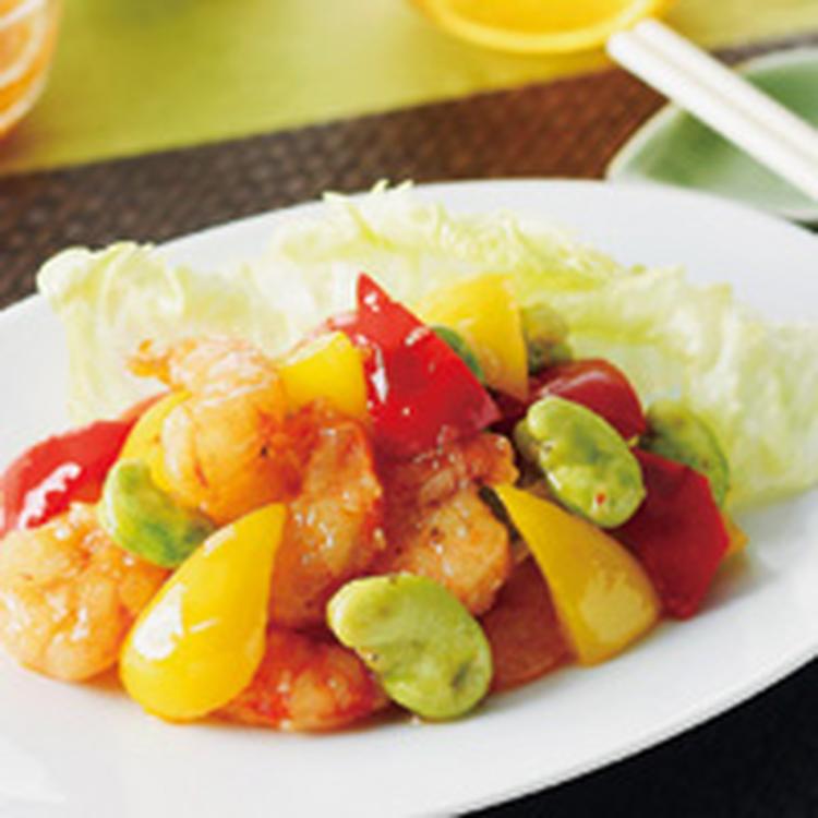 フライパンにサラダ油を熱し、(2)を炒め、火が通ったら(1)のえびを加え、(4)のソースを手早く回しかける。
