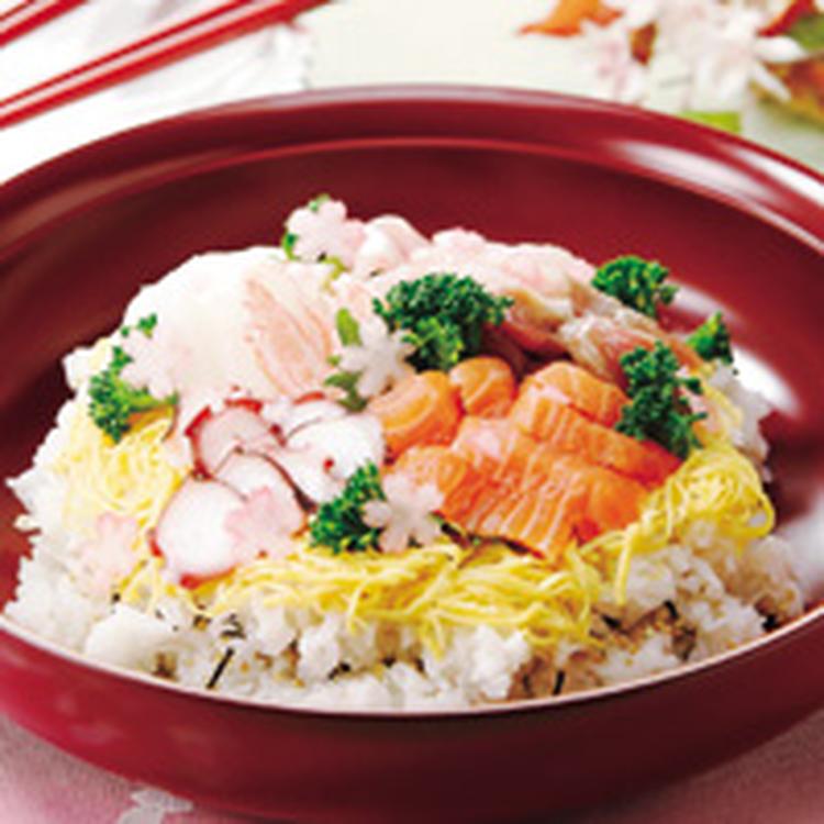 (2)のご飯を器に盛り、その上に刻みのりを敷き、(3)をたっぷりのせ、寿司種パックの魚を切り揃え、彩り良く並べる。いりごま、刻んだ大葉、茹でて小さく切ったブロッコリーをのせ、準備できれば梅酢でそめて桜型に抜いた大根を飾る。好みでわさびを添える。