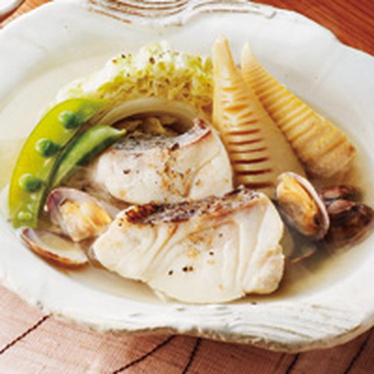 (3)の鍋にだし汁と(2)のたけのこを入れる。Aで調味し、アクを取りながら10分煮る。(4)の鯛、キャベツを入れて火が通るまで煮る。