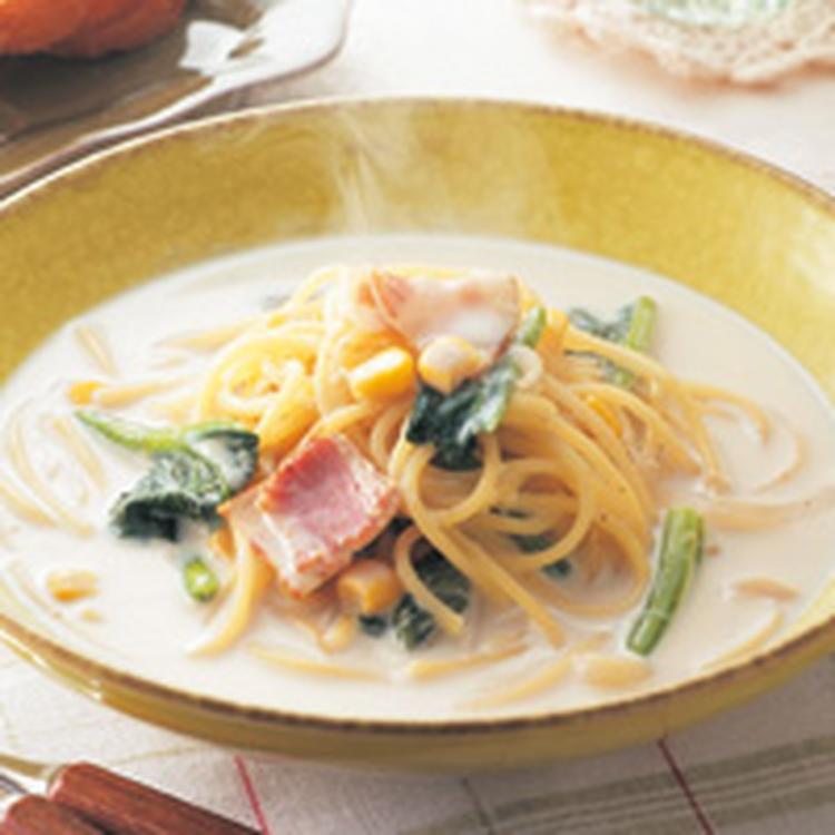 ベーコンとほうれん草の豆乳スープパスタ