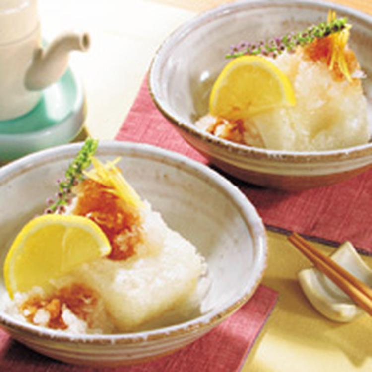 半月切りにしたゆずをのせ、残りの大根おろしをかけてしょうゆを適量かける。