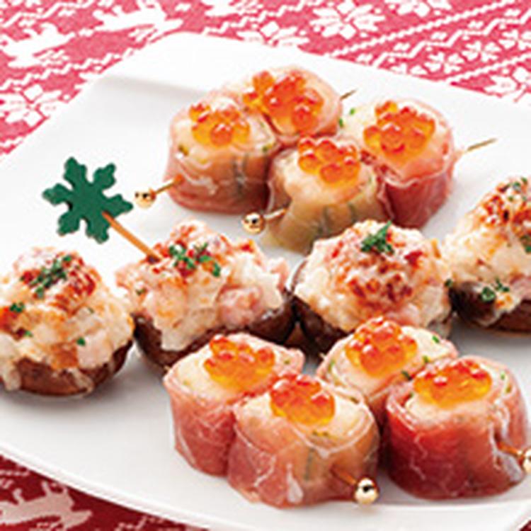 ラップを広げて生ハム・ピーラーで薄くスライスしたきゅうりを順に重ね、(3)をのせてラップごと巻く。8等分に切ってピックで刺し、イクラをのせて(2)と共に器に盛る。