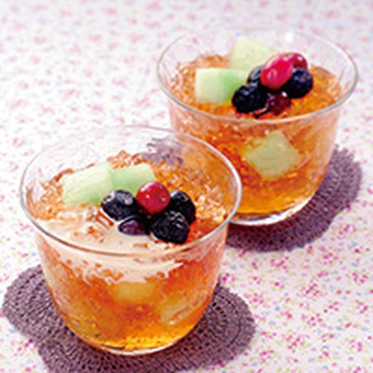 グラスにメロン・ミックスベリー・くずした(1)を入れ、エバミルクをかけいただく。