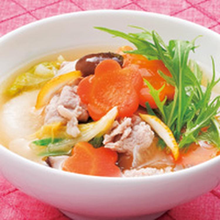 (1)に(2)をかけ、水菜・ゆずの皮をのせる。