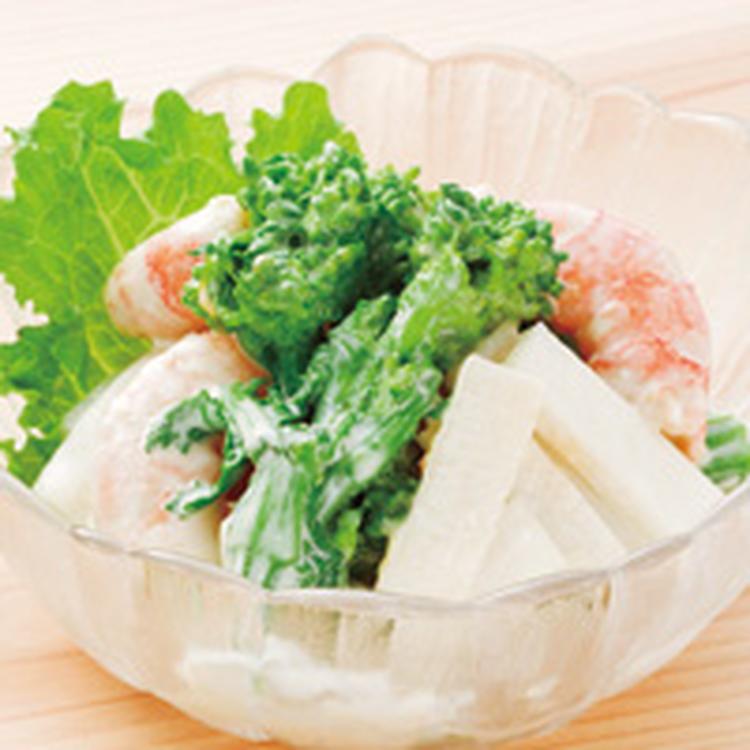 ボウルに(1)・ウド・Bを入れて混ぜ合わせ、グリーンリーフと共に器に盛る。