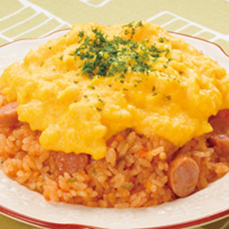 フライパンにバターを中火で熱し、A・ご飯の順に中火で炒める。ケチャップを加えて全体を炒め合わせる。