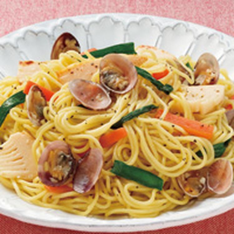 フライパンにサラダ油とにんにくを中火で熱し、アサリと酒を入れて蓋をし、アサリの口が開くまで蒸す。
