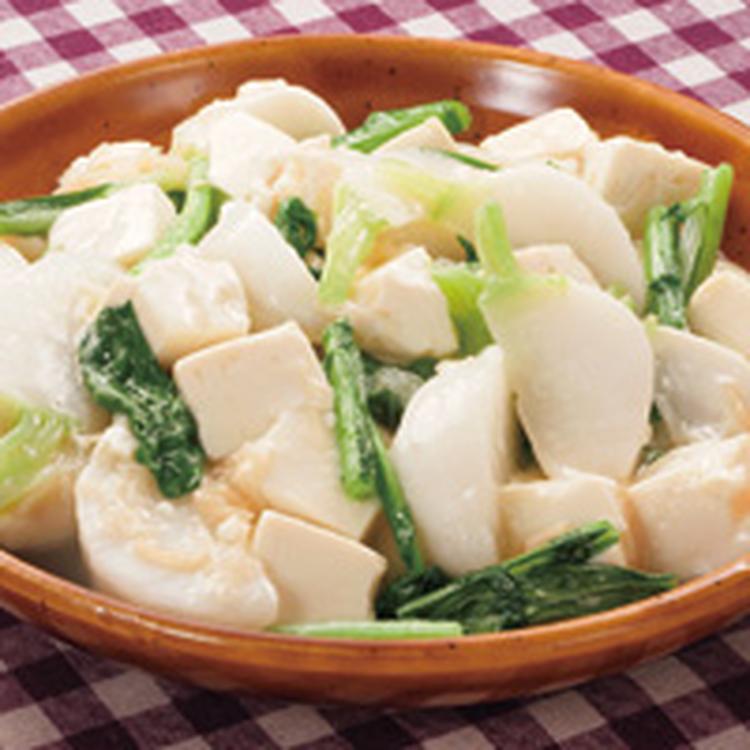 フライパンにサラダ油を熱し、(1)を中火で炒める。(2)・Aを加えて弱めの中火で約3分煮る。豆腐を加え、同量の水で溶いた片栗粉でとろみをつける。