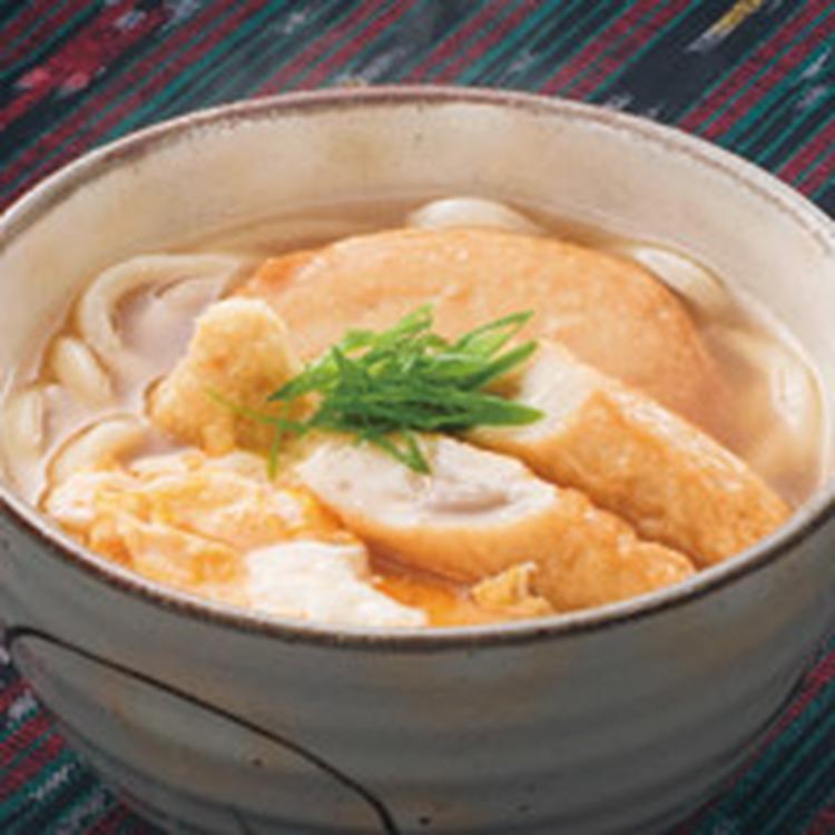 鍋にだし汁を入れて強火で煮立て、うどんを加える。ごぼ天・丸天を加えたらAを加え、同量の水で溶いた片栗粉を入れてとろみをつける。卵を流し入れて火を止める。