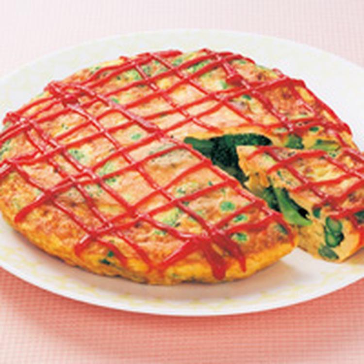 フライパンにオリーブ油を中火で熱し、(1)とBを混ぜ合わせて流し入れる。手早く混ぜ合わせて蓋をし、弱火で約3分焼く。ひっくり返して更に約3分焼く。