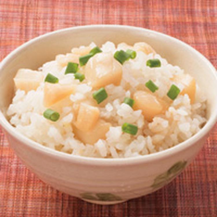 炊きあがったらほたてを加えて約10分間蒸す。だし昆布を取り出して全体を混ぜ合わせ、器によそって青ねぎを散らす。