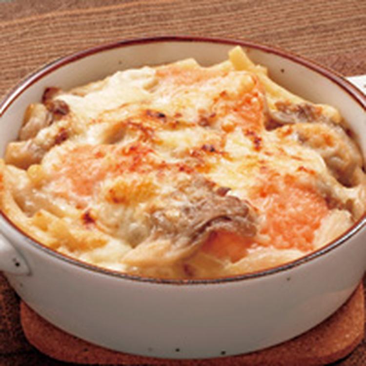 バター(分量外)を塗った耐熱容器に(2)を入れ、ミックスチーズをかける。オーブントースターでこんがりと焼き色がつくまで焼く。