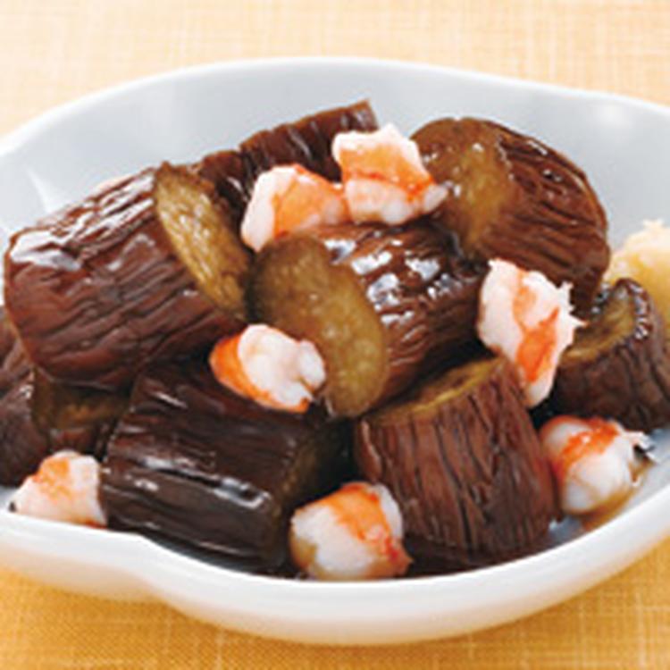 鍋にA・(1)のナスを入れて落し蓋をし、ゆっくりと煮る。ナスに火が通ったら(1)のえびを入れてさっと煮立て、同量の水でといた片栗粉でとろみをつける。器に盛ってしょうがを添える。