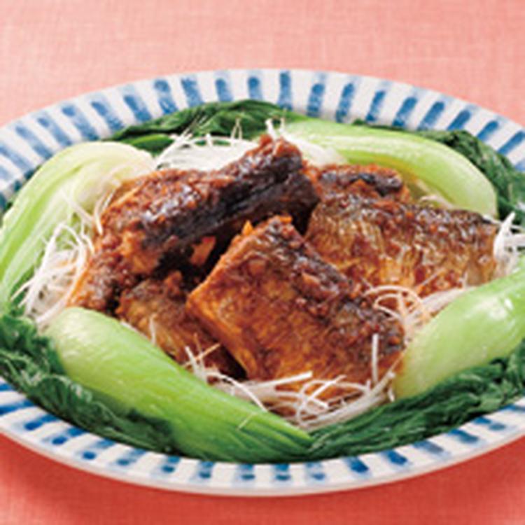 同じフライパンにサラダ油を熱してトウバンジャンを入れ、にんにく・しょうがを加えて炒める。Aを入れて煮立ったら(2)を戻し入れ、返しながら煮絡める。