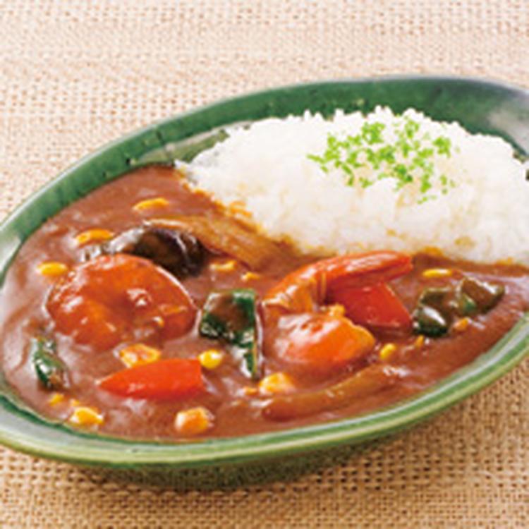 (1)のフライパンの油を拭き取り、中火で加熱して(1)のエビ・玉ねぎ・ピーマンを炒める。カレーのパッケージ通りの水を加え、ひと煮立ちしたらルウを加えて煮溶かす。