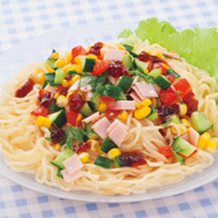 器にレタス、パッケージ通りにゆでた麺、Bを彩りよくのせる。フォークで砕いた(1)をのせる。