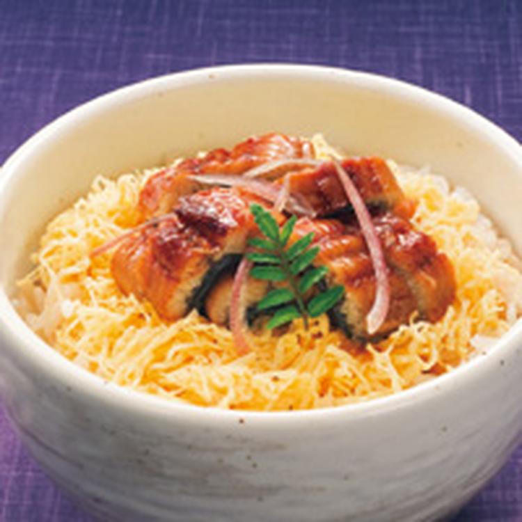 (2)に錦糸玉子・(1)をのせてラップをかけ、電子レンジで約1分加熱して薄切りにしたみょうが(分量外)と木の芽をのせる。