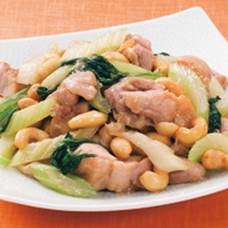 フライパンにサラダ油を熱し、(1)の鶏肉を中火で炒める。セロリ・しょうが・残りの(1)を加えて炒め合わせ、水溶き片栗粉でとろみをつける。