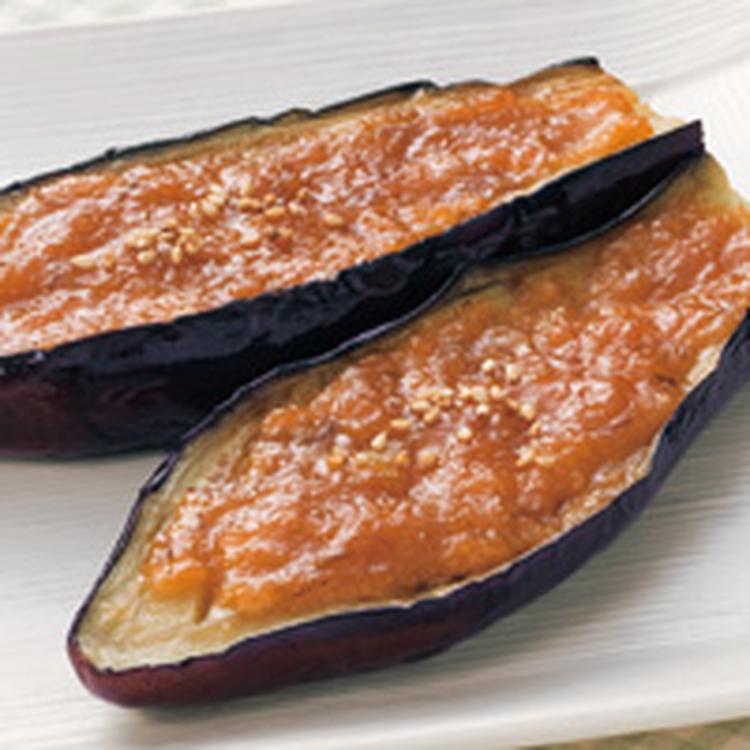 なすは縦2等分にし、内側に格子状に切り目を入れる。
