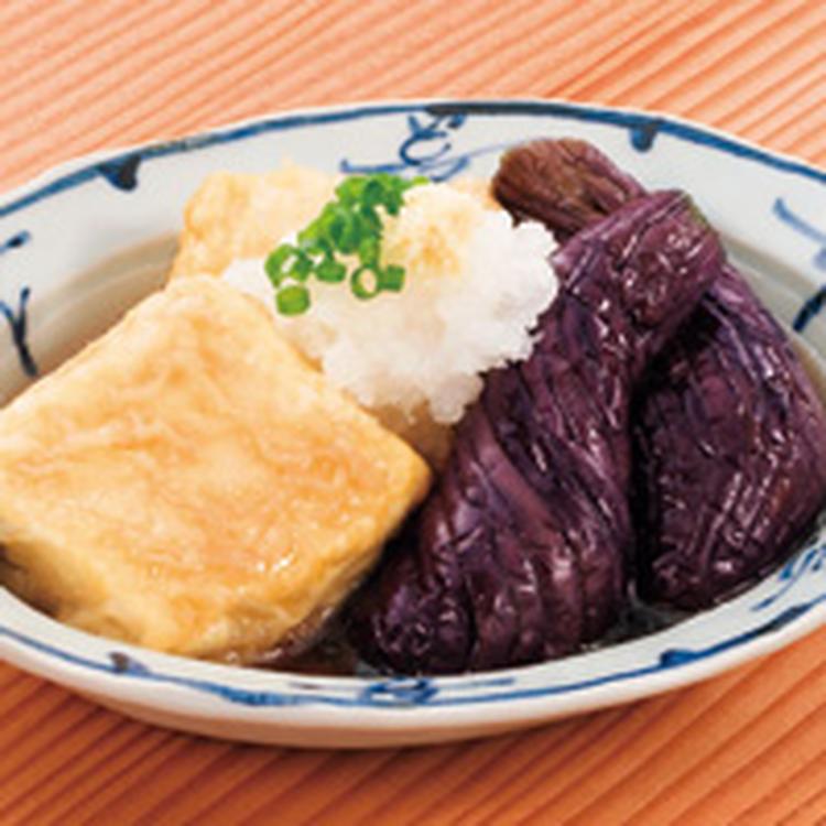 豆腐はキッチンペーパーで包んで耐熱容器にのせ、電子レンジで約2分加熱して水気を切る。4つ切りにして混ぜ合わせたBを全体にまぶし、(2)と共に中温の揚げ油で揚げる。なすは押しつけながらねじる。
