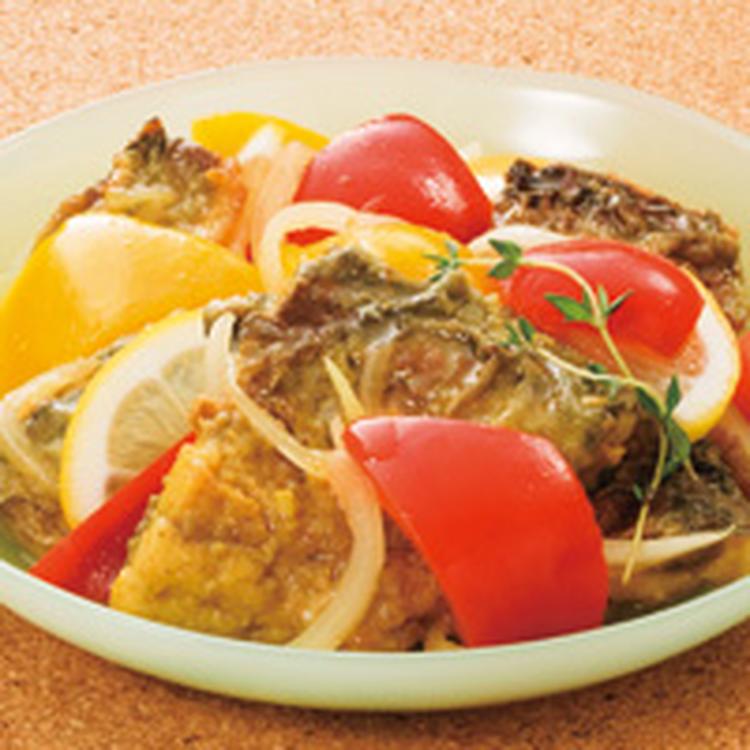 フライパンにオリーブ油を熱してにんにくを中火で炒め、パプリカ・玉ねぎを加えて軽く炒める。Bを加えてひと煮立ちさせたらバットに広げる。