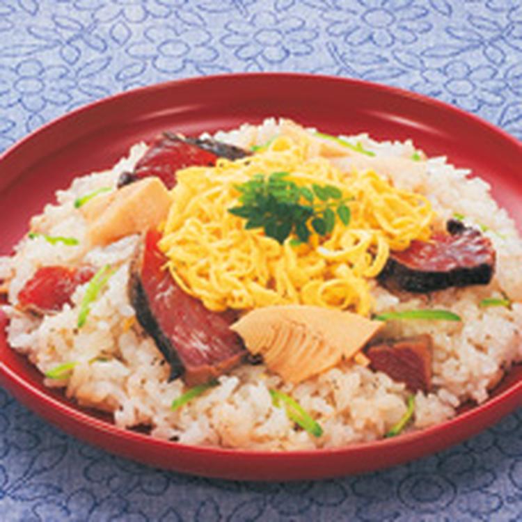すし飯にしょうが・絹さや・(1)・(2)を加えて混ぜ合わせる。