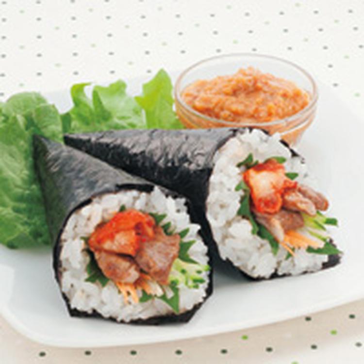 のりに(3)を広げて(2)・お好みのCをのせる。器に盛ってグリーンリーフを添え、(1)をつけていただく。