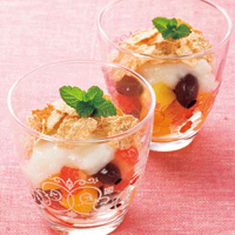 グラスに食べやすい大きさに切ったA・黒豆を入れて(1)をかけ、コーンフレークをのせてミントを飾る。