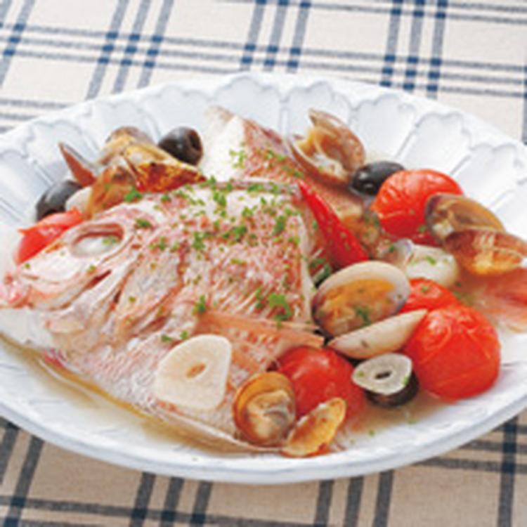 鯛は塩・こしょうを振る。フライパンにオリーブ油を中火で熱し、鯛を皮目から入れて両面こんがりと焼く。
