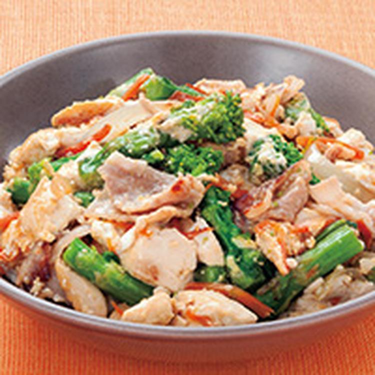 豚肉・人参・玉ねぎを加えてサッと炒め、菜の花・酒を加えて約30秒蓋をする。