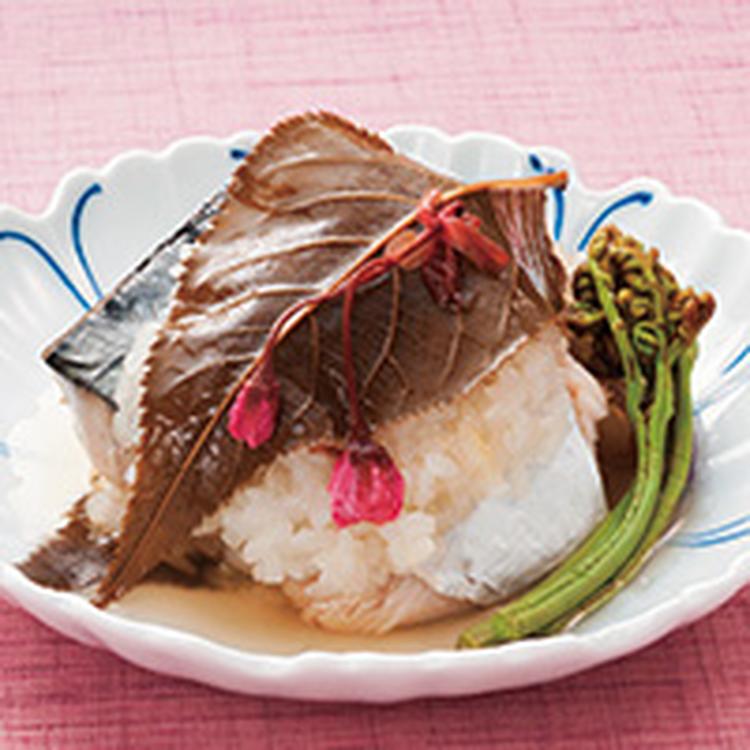 道明寺粉は1/2カップの湯で戻し、(1)の鰆を包んで更に桜の葉で包む。