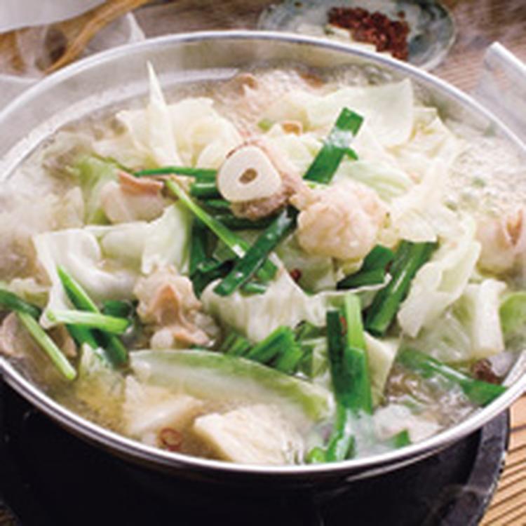ステンレスの鍋、または土鍋に牛ホルモン、(1)の野菜をキャベツ、もやし、にらの順に1/2量ずつのせ、(2)の1/2量を加える。(3)のスープをひたひたに注ぎ、火にかける。