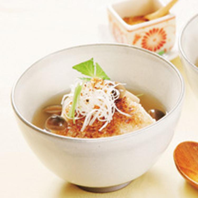 丼に焼きおにぎりを入れ、(4)のスープをかけて刻んだ三つ葉をのせる。好みで七味唐辛子をかけても良い。