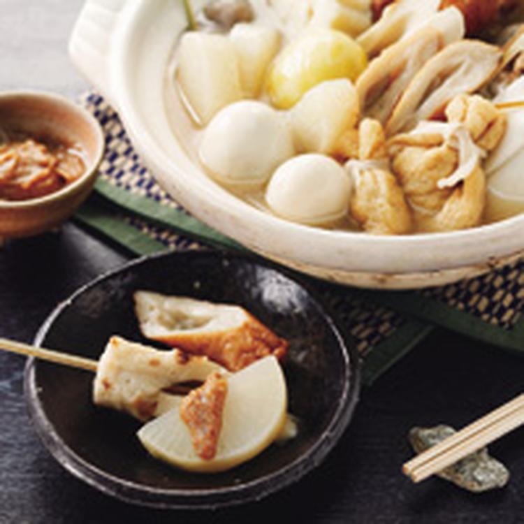 おでん種は(油で揚げたもの)ザルに取り、熱湯をかけて油抜きをしておく。じゃがいもは丸ごと下茹でして、皮をむいておく。こんにゃくは塩でもんで下茹でしておく。大根は厚さ2.5cm位の輪切り(大きければ半月)にする。