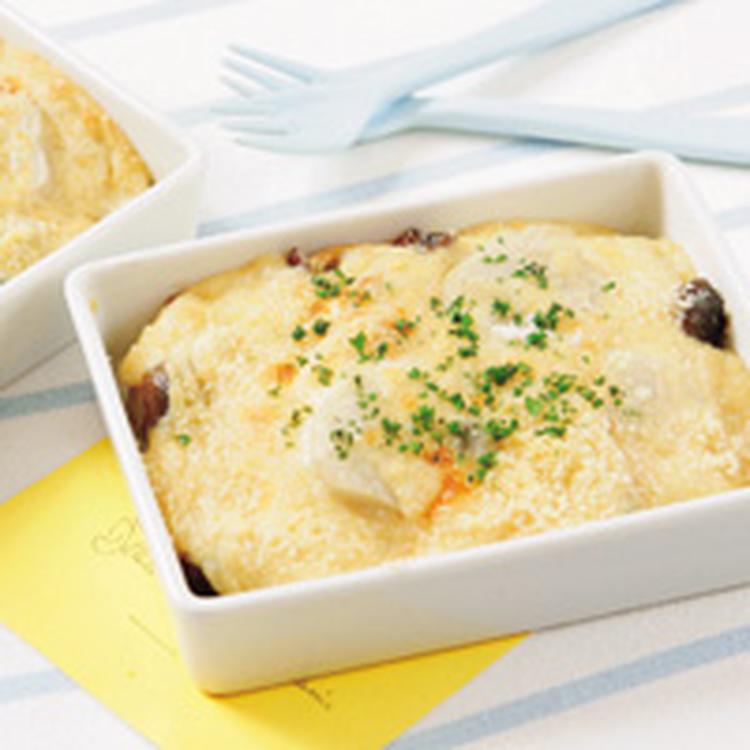 耐熱皿にバター(分量外)を塗り、里芋を斜めに重ねて並べ、その上に(2)で炒めたベーコンとしめじをのせる。豆乳ホワイトソースをまんべんなくのせ、生クリーム、粉チーズをかけてオーブントースターで焼き目がつく程度に焼く。
