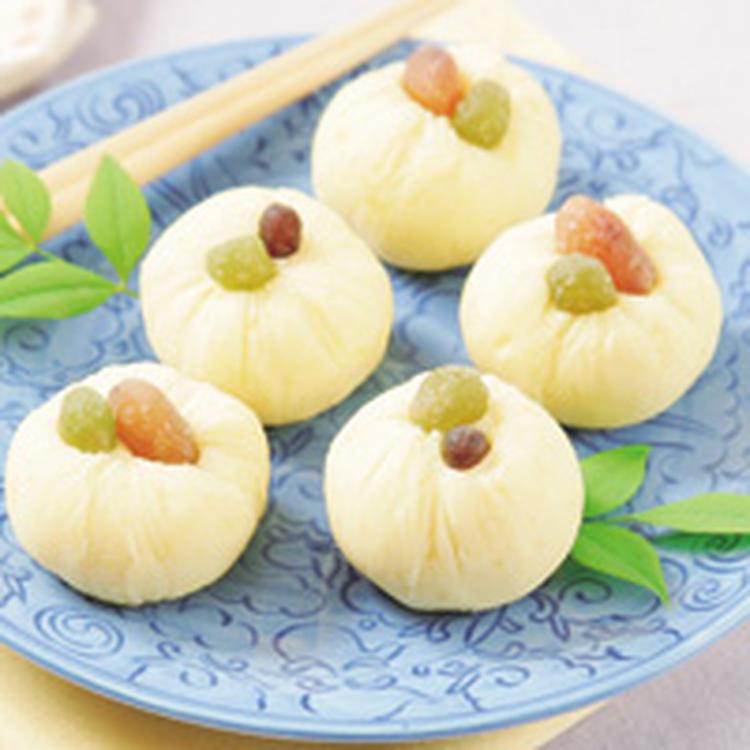 (2)を8等分にして1つをラップにのせ、ラップごと茶巾に絞る。残りも同様に作る。