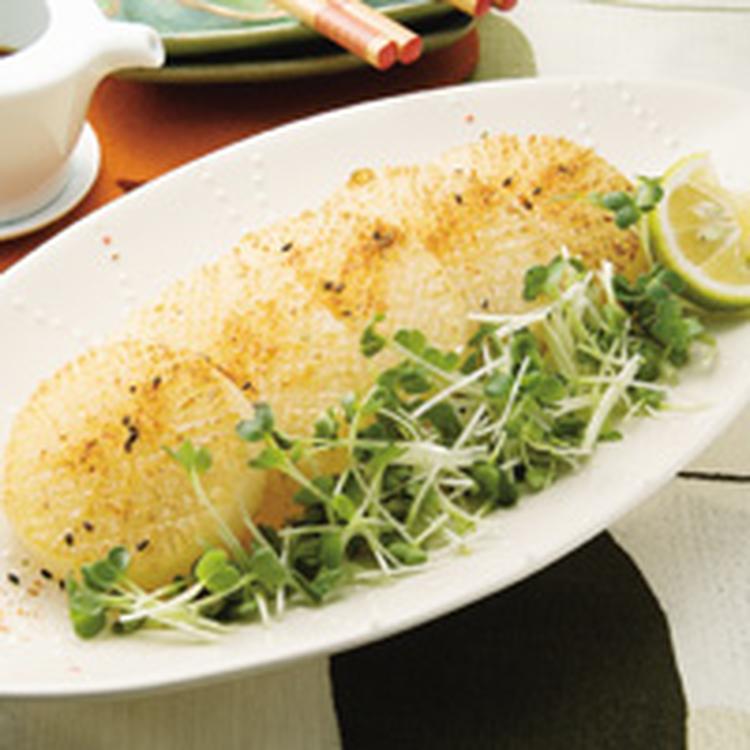 フライパンに分量のバターを入れて熱し、(3)の大根を加える。バターを焦がさないように、両面をこんがりと焼く。
