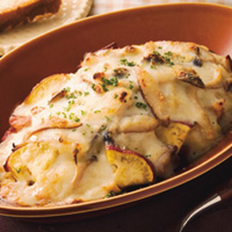 耐熱皿に(3)を4等分し、(6)のホワイトソースを4等分してたっぷりかける。粉チーズをふり、オーブンで15~20分焼く。