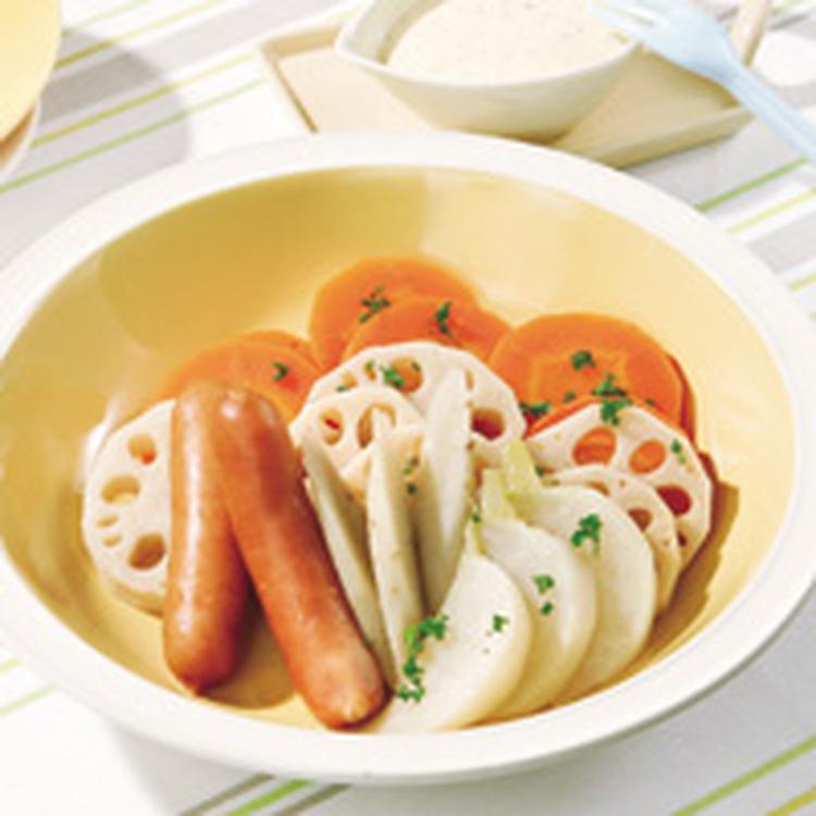 ソーセージを加えてさっと煮、器に盛り付ける。あればパセリのみじん切りを散らし、(4)を添える。