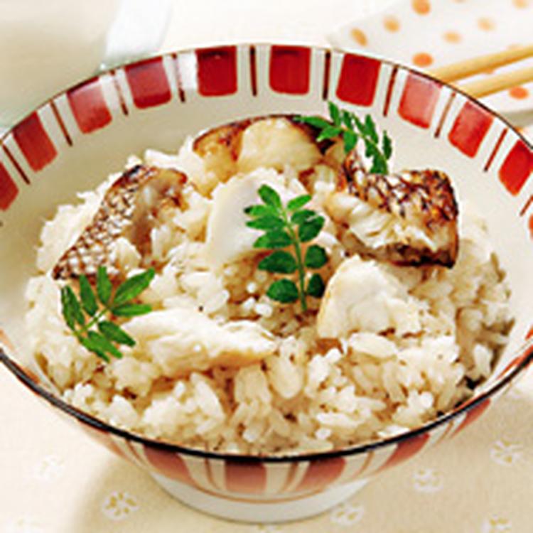(1)の鯛を魚焼きグリルで両面香ばしく焼き、(2)の炊き上がった釜に入れ、しばらく蒸らす。