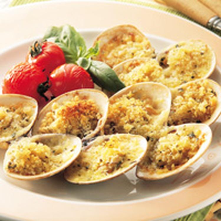 オーブントースターの天板に(6)とミニトマトをのせ、オリーブオイルをまわしかける。パン粉がこんがりとキツネ色になったら取り出す。