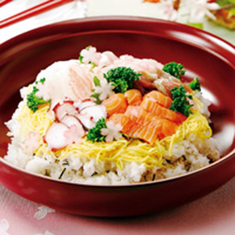 ご飯を器に盛り、その上に刻みのりを敷き、(3)をたっぷりのせ、寿司種パックの魚を切り揃え、彩り良く並べる。いりごま、刻んだ大葉、茹でて小さく切ったブロッコリーをのせ、準備できれば梅酢でそめて桜型に抜いた大根を飾る。好みでわさびを添える。