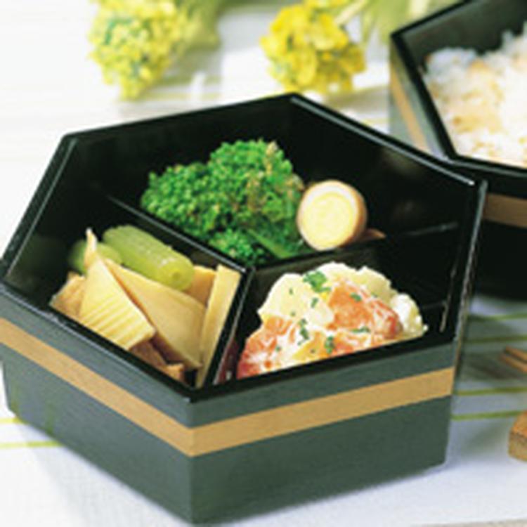 弁当箱にご飯を詰め、甘酢しょうがをのせて白ごまを散らす。おかずはそれぞれバランスよく詰め合わせる。