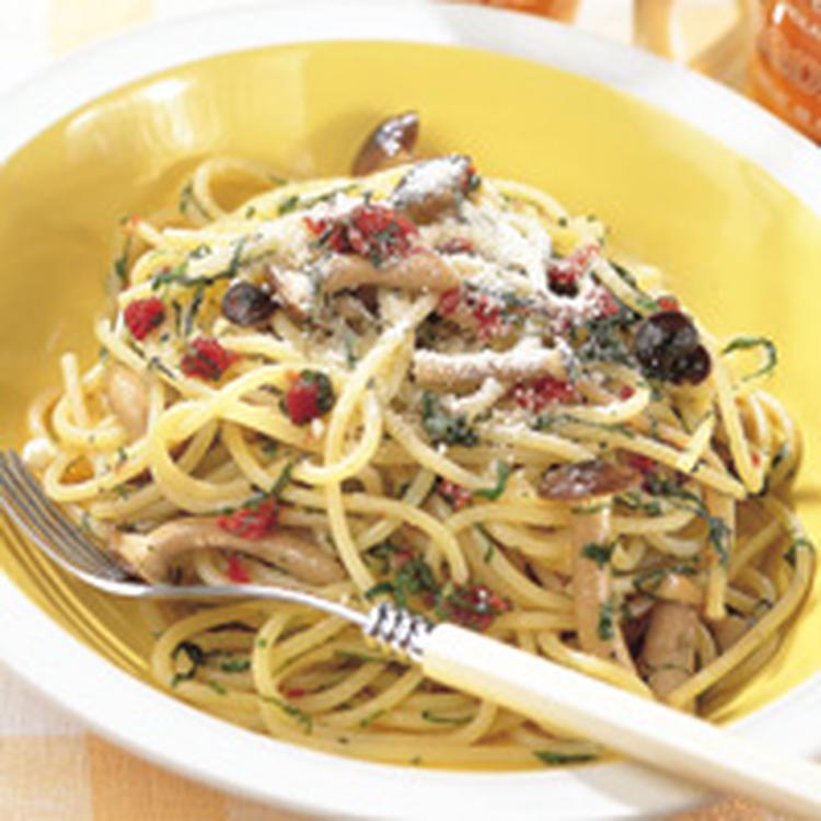 フライパンにサラダ油を入れて熱し、しめじを炒める。塩、こしょうを軽くふり、茹であがったスパゲッティの水気をよくきって加える。