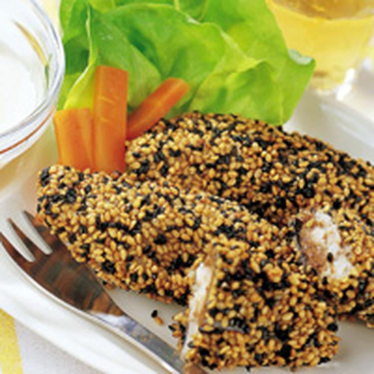 (1)を食べやすい大きさに切り、小麦粉をうすくまぶし、卵白をつけてごまをしっかりとまぶしつける。