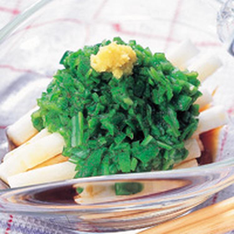 器に長芋を盛って(1)のオクラをのせる。二杯酢の材料を混ぜ合わせてかけ、おろししょうがをのせる。