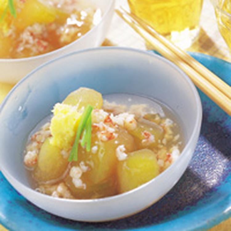器にとうがんを盛り付け(煮汁は除く)、(4) を上からかける。おろししょうがを添え、あれば茹でた三つ葉の軸を飾る。
